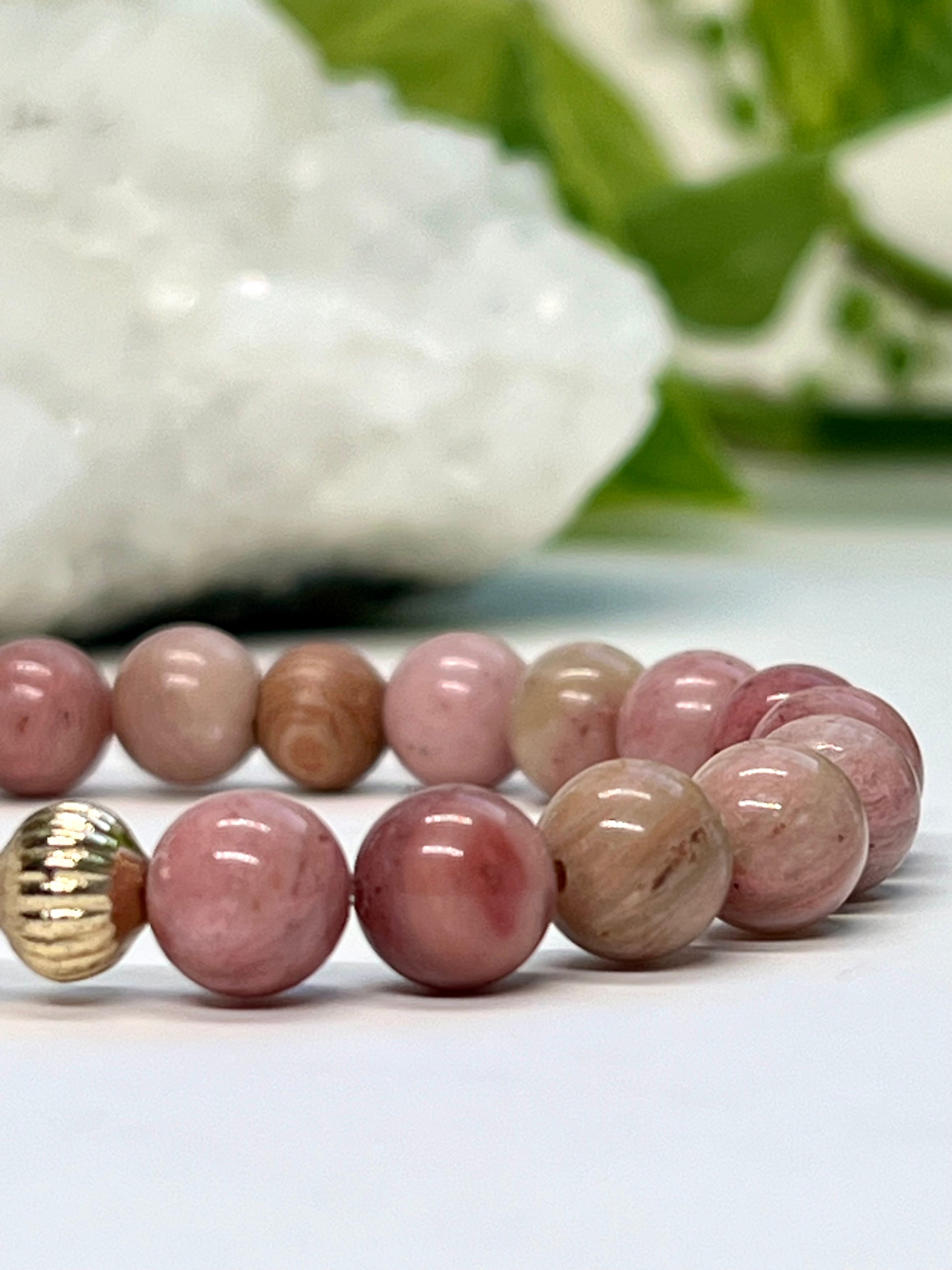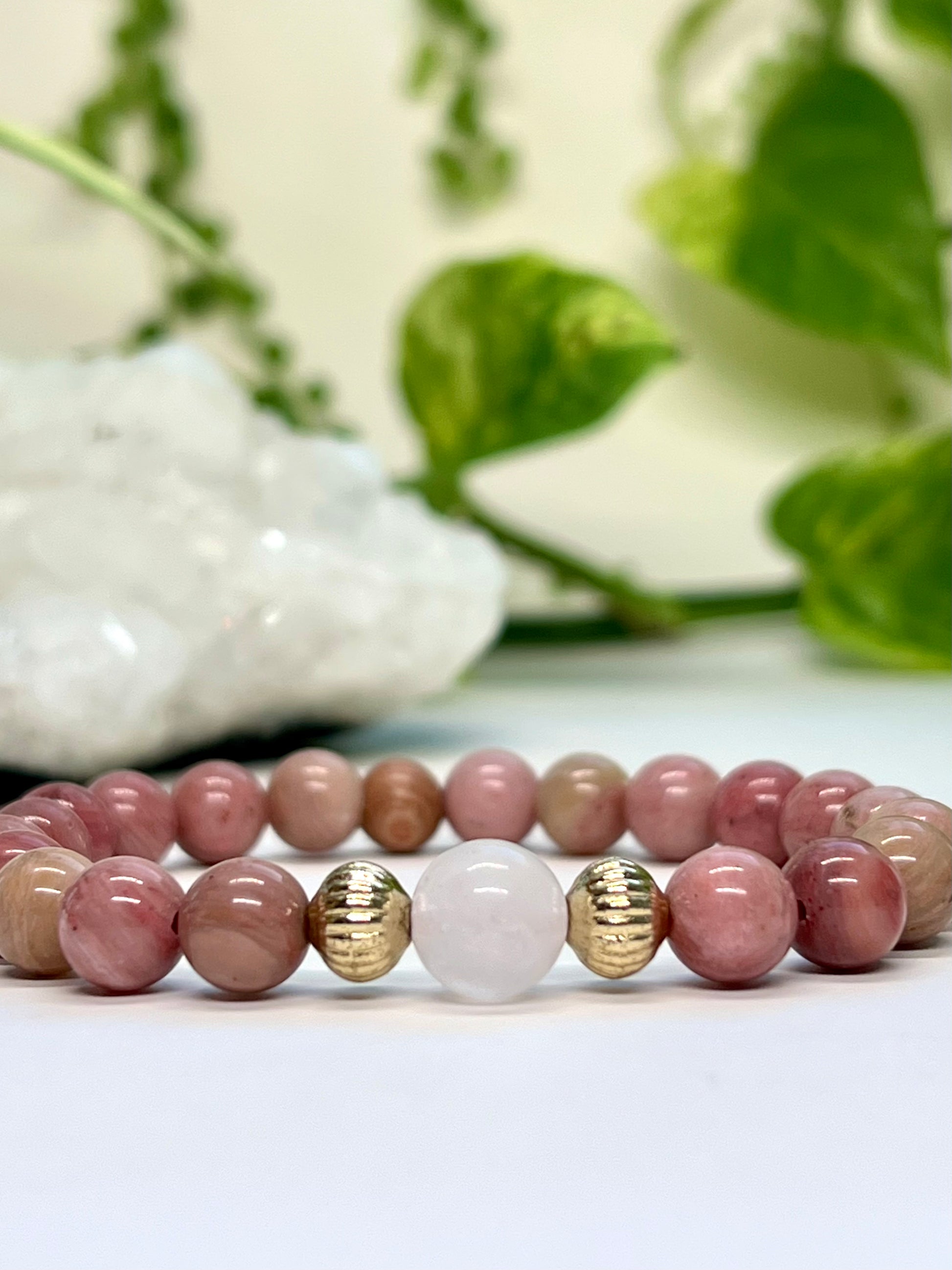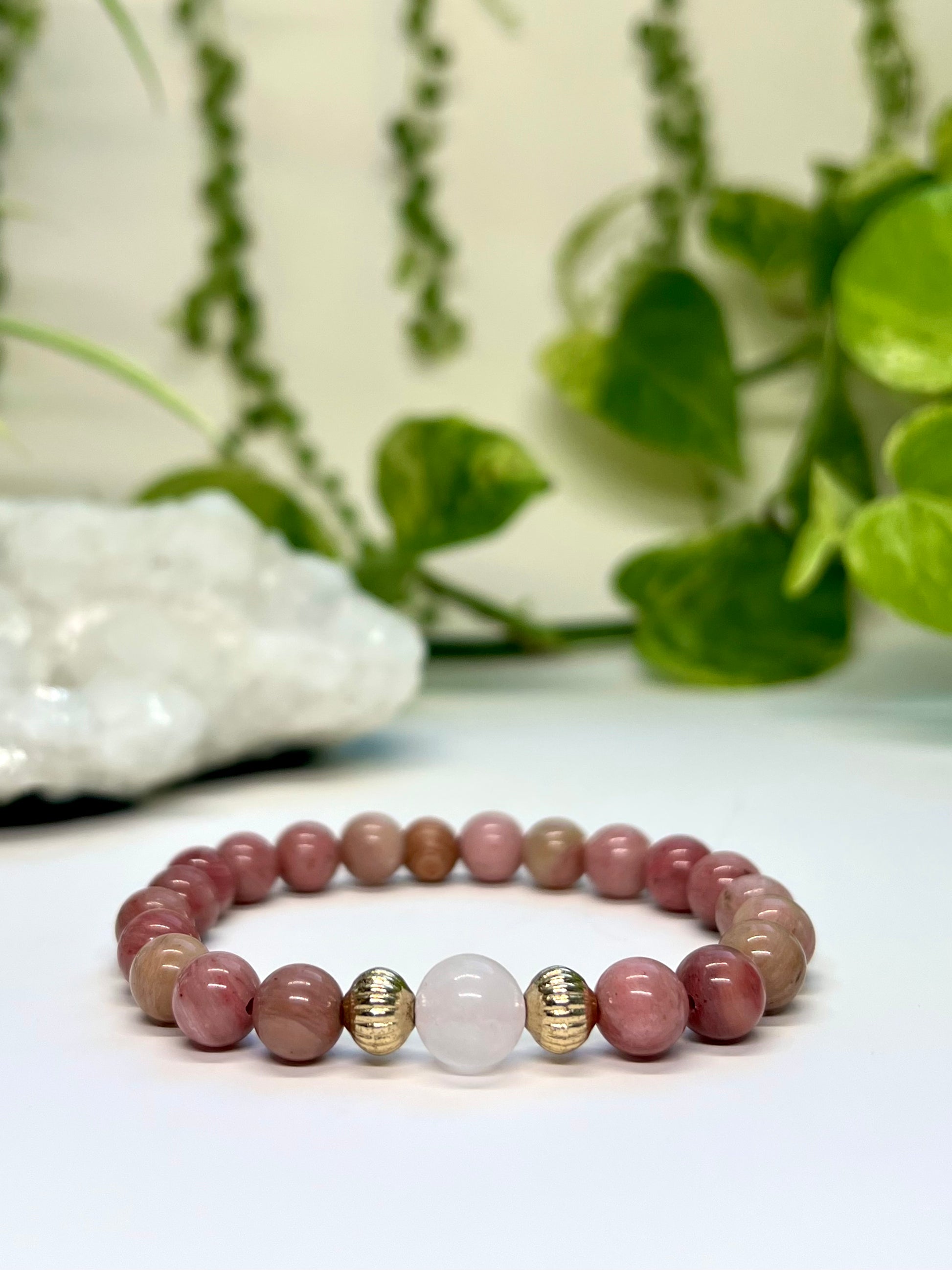 This gentle and loving bracelet blends the nurturing energy of Rose Quartz with the passionate healing power of Rhodochrosite, accented by warm gold spacers and grounding Rosewood. Rose Quartz is the ultimate stone of unconditional love, encouraging self-love, compassion, and emotional healing. Rhodochrosite opens the heart to joy, forgiveness, and deep emotional renewal. Together, these crystals create a tender energy that soothes emotional wounds and invites harmony into your relationships. The gold spacers add a touch of elegance and amplify the bracelet’s radiant energy, while Rosewood grounds and balances the overall vibration with its warm, heart-centred presence.