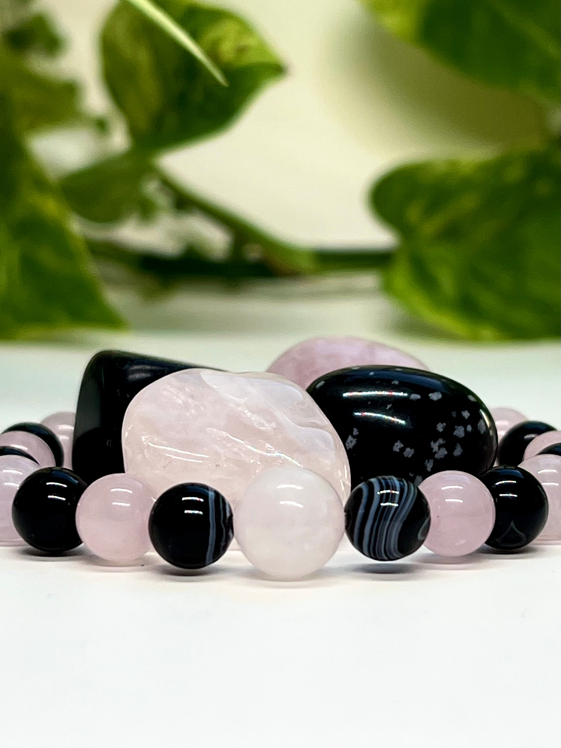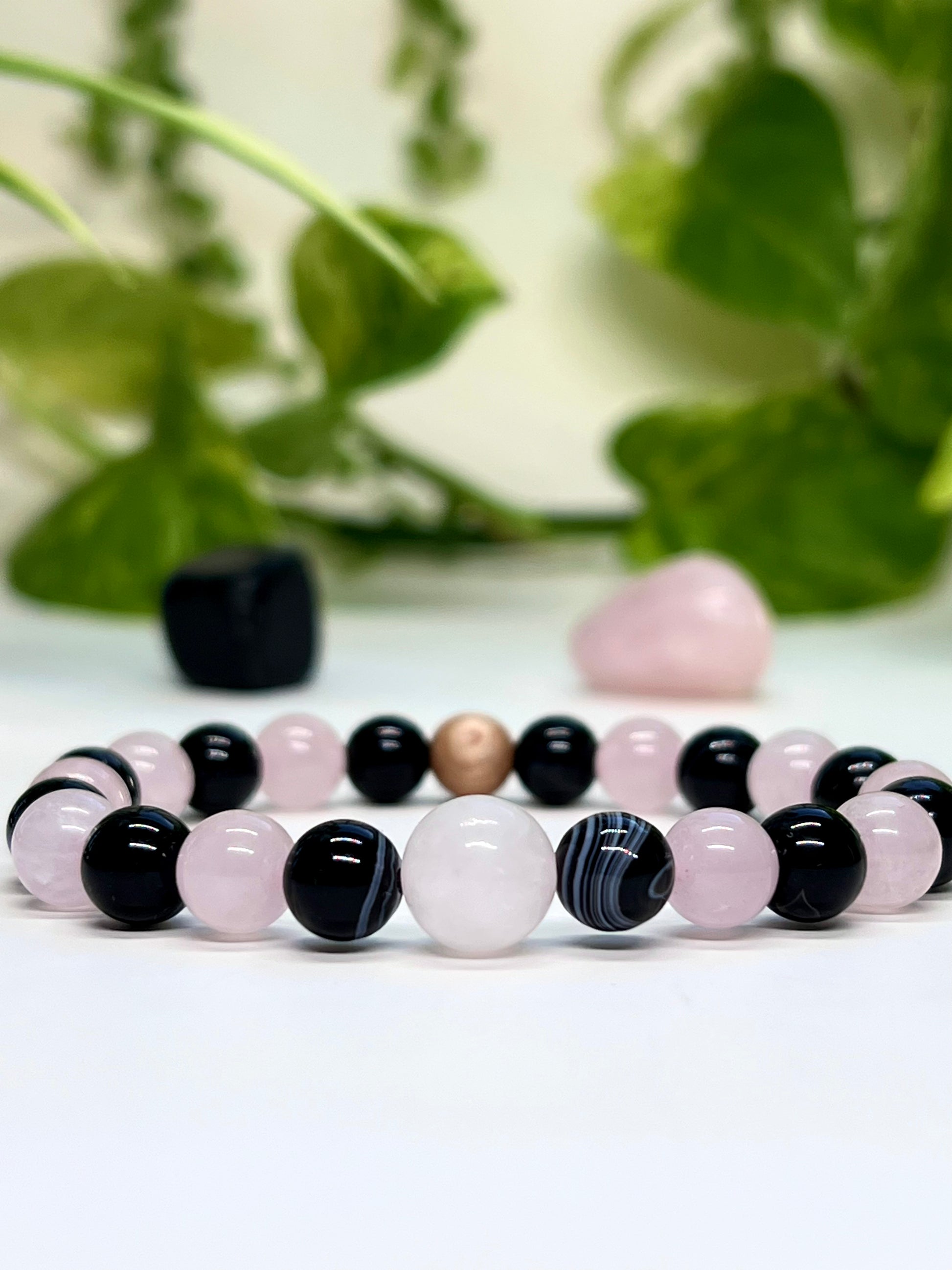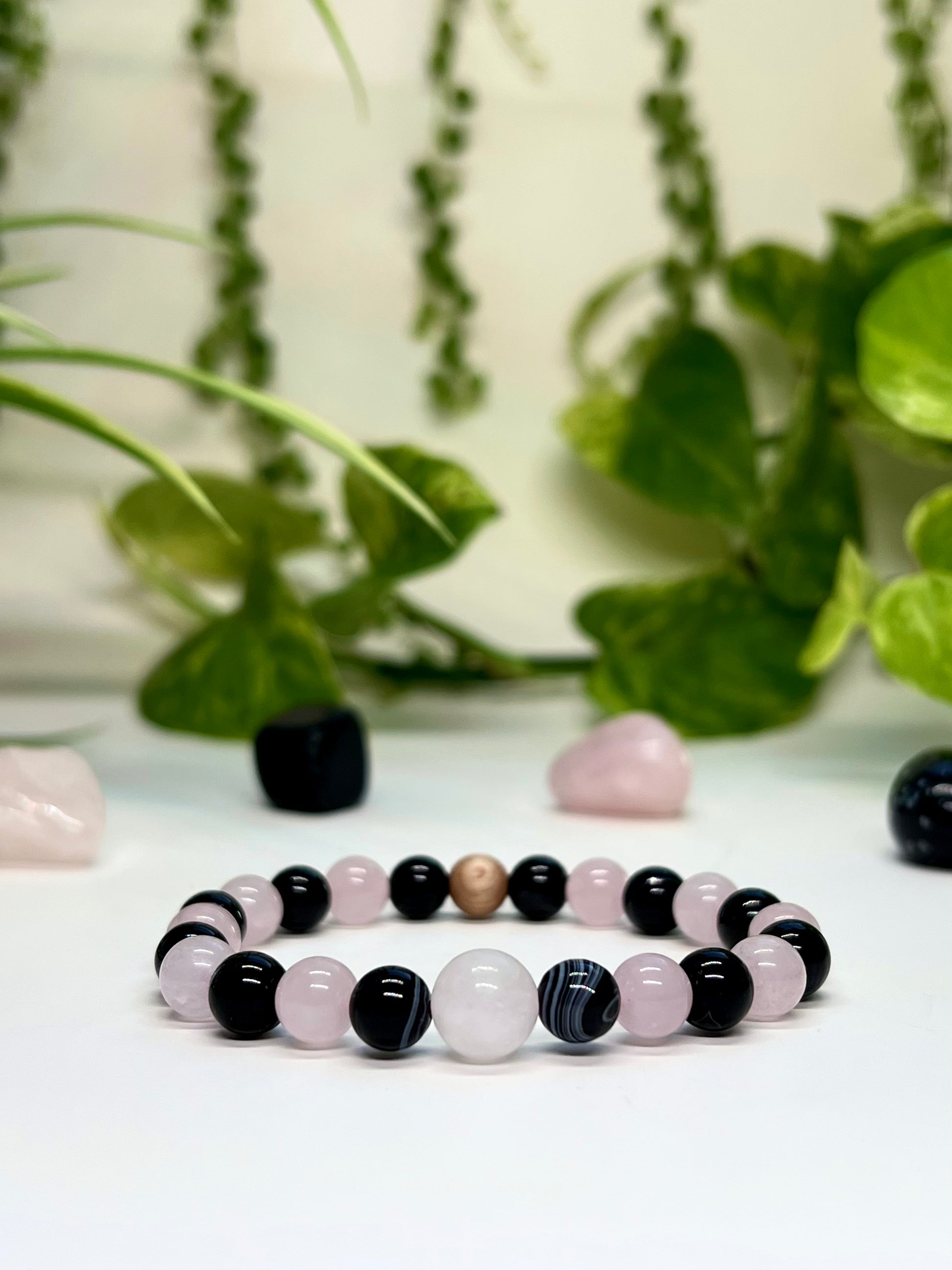 This bracelet beautifully balances the tender energy of Rose Quartz with the grounding strength of Banded Black Onyx, all tied together by the warm presence of Rosewood. Rose Quartz, the stone of unconditional love and compassion, opens the heart to healing and self-love, promoting peace and emotional harmony. Banded Black Onyx offers powerful protection, absorbing negativity and providing stability during stressful times. Rosewood adds a nurturing, grounding energy that enhances spiritual connection and emotional balance. Together, these elements create a harmonious bracelet that supports both gentle healing and inner strength.
