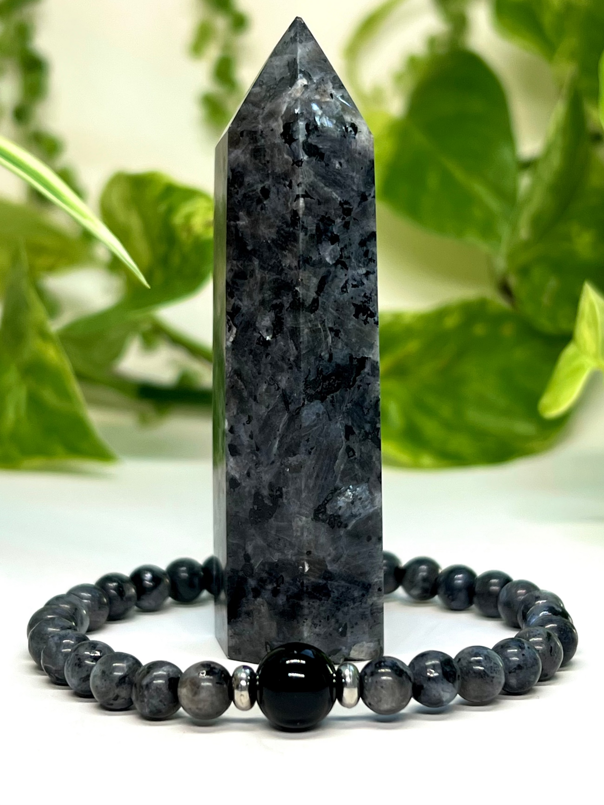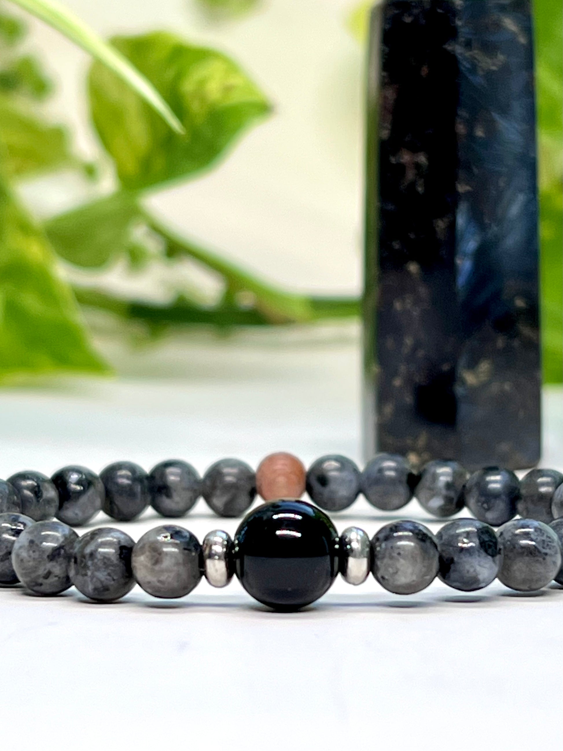 Embrace the mysterious and protective energies of Black Moonstone combined with the powerful grounding force of Black Obsidian. Black Moonstone offers intuitive insight, calming the emotional tides while helping you connect deeply with your inner wisdom. The singular Black Obsidian bead acts as a strong shield, deflecting negativity and encouraging profound transformation. Silver spacers add a subtle shimmer that complements the natural warmth of Rosewood, grounding this bracelet’s energy with gentle strength. Perfect for those seeking emotional balance, protection, and spiritual growth.