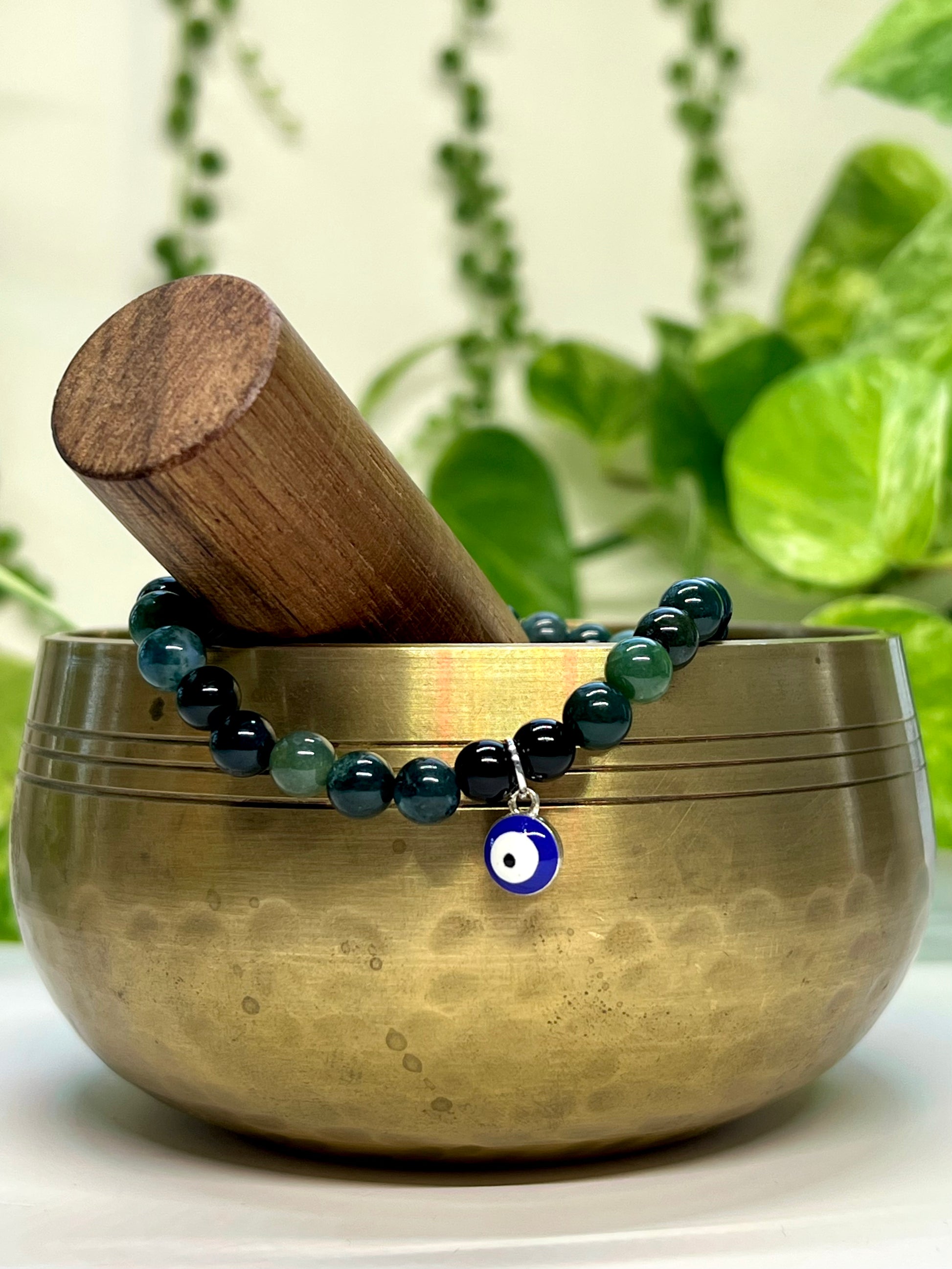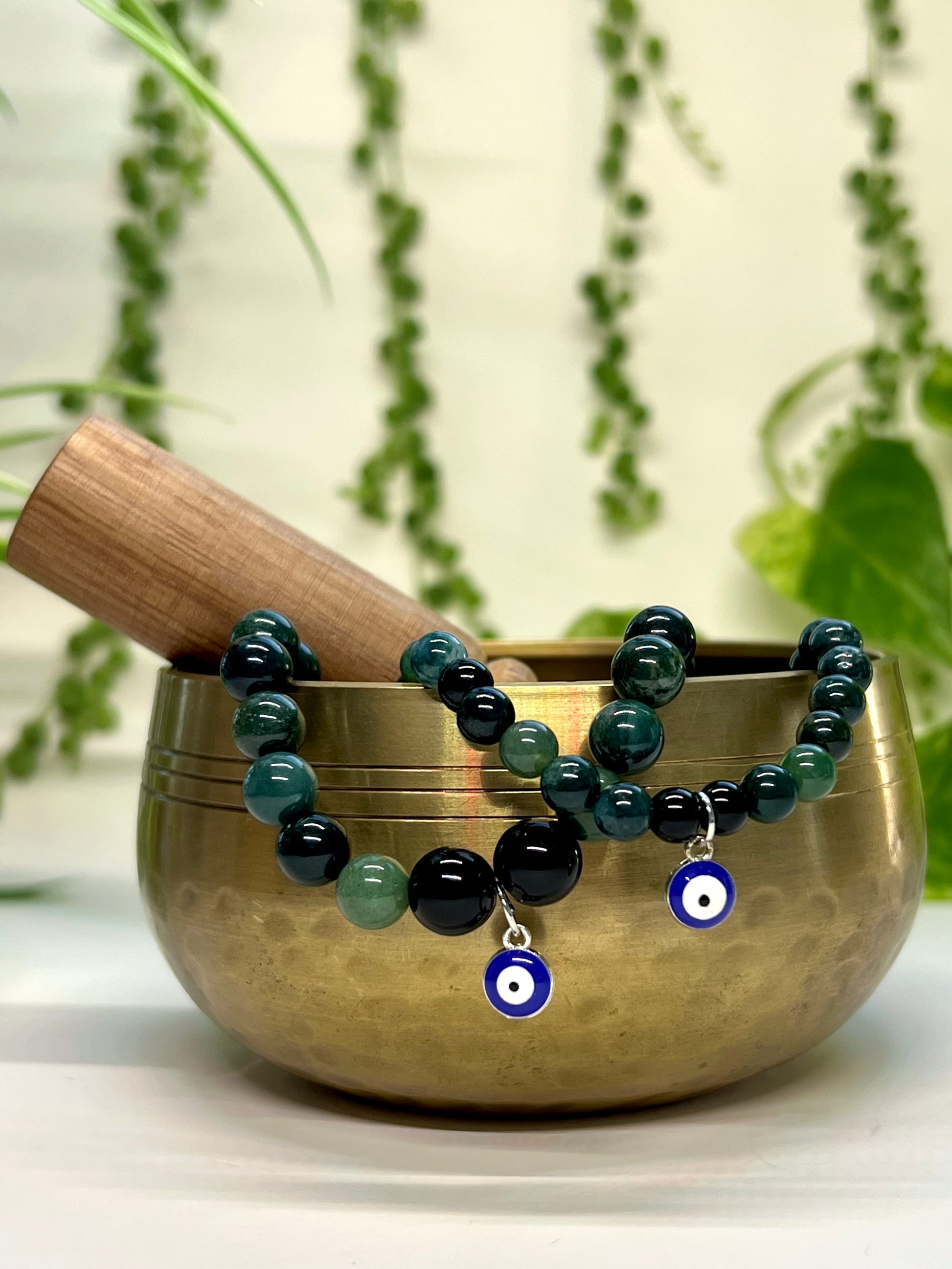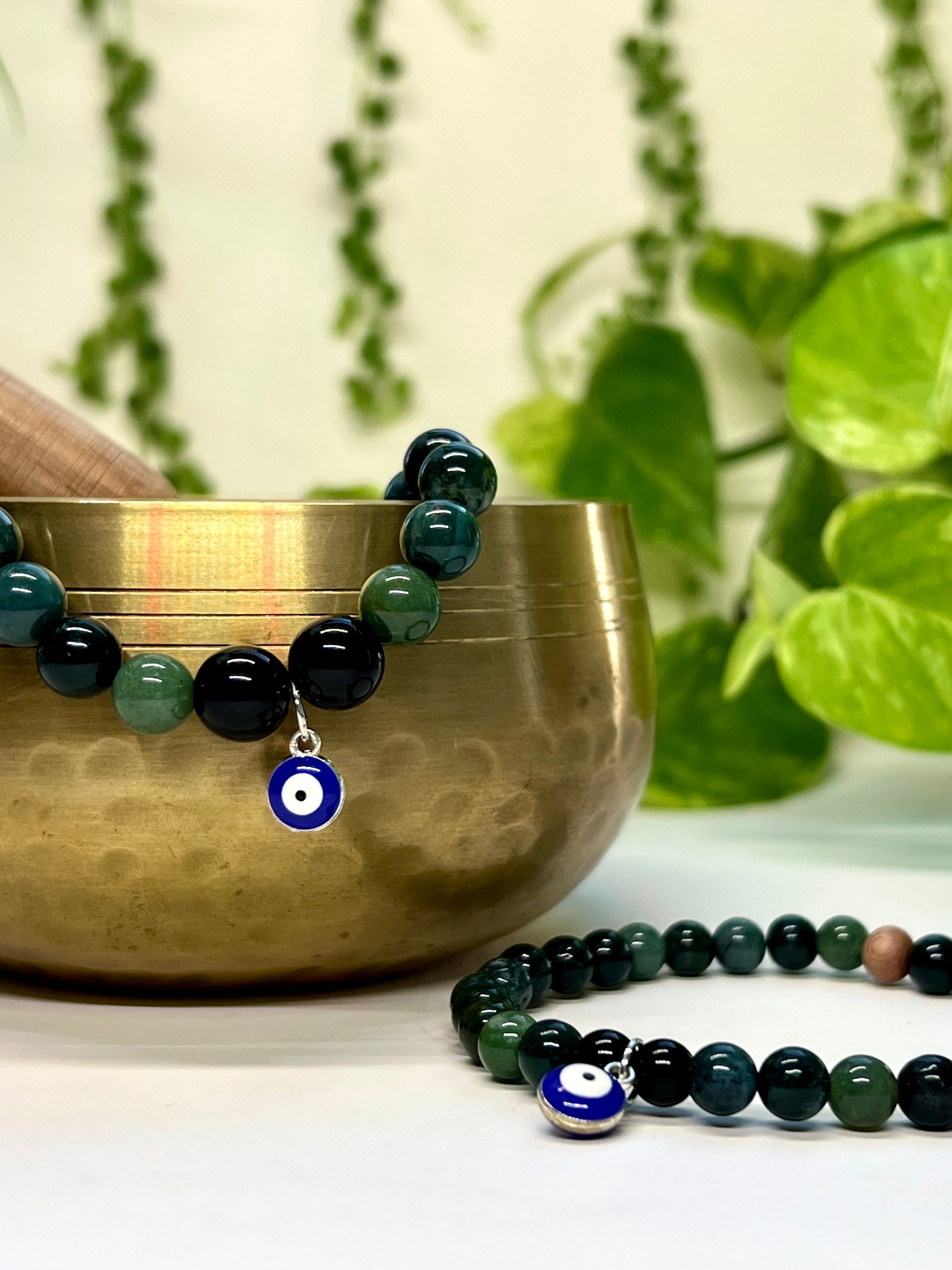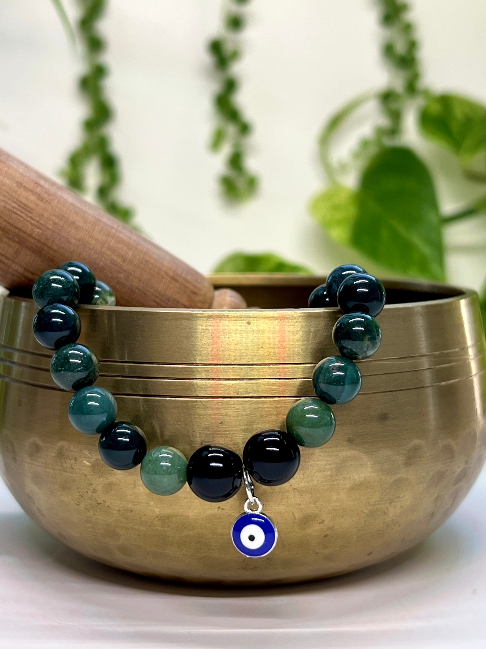 This powerful bracelet blends grounding, protection, and spiritual clarity to keep you centered and shielded throughout your day. Moss Agate brings gentle healing and a deep connection to nature, fostering growth, abundance, and emotional balance. The Black Obsidian beads offer strong psychic protection, absorbing negativity and unveiling hidden truths. A striking Evil Eye pendant wards off negative intentions, acting as a spiritual shield against harm.