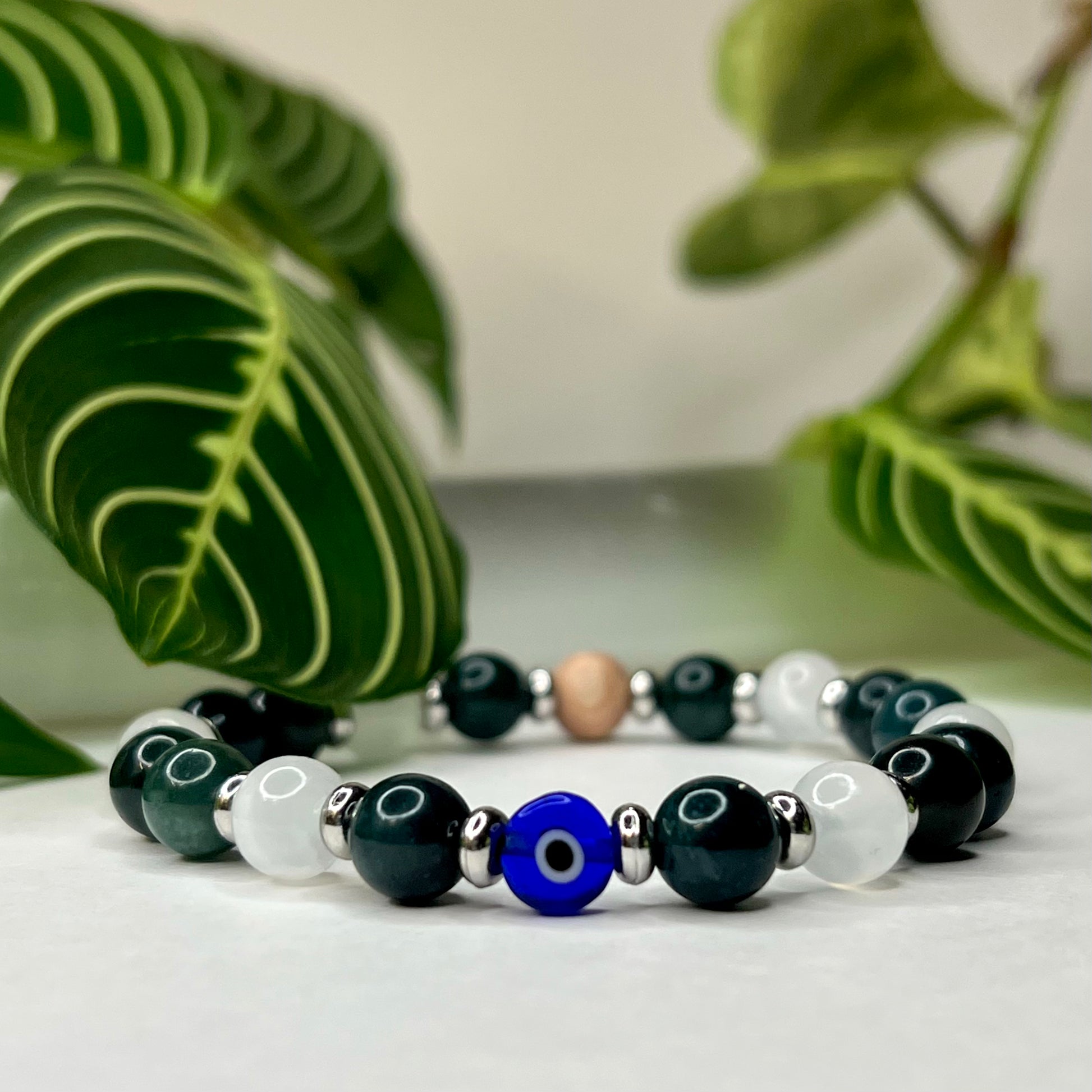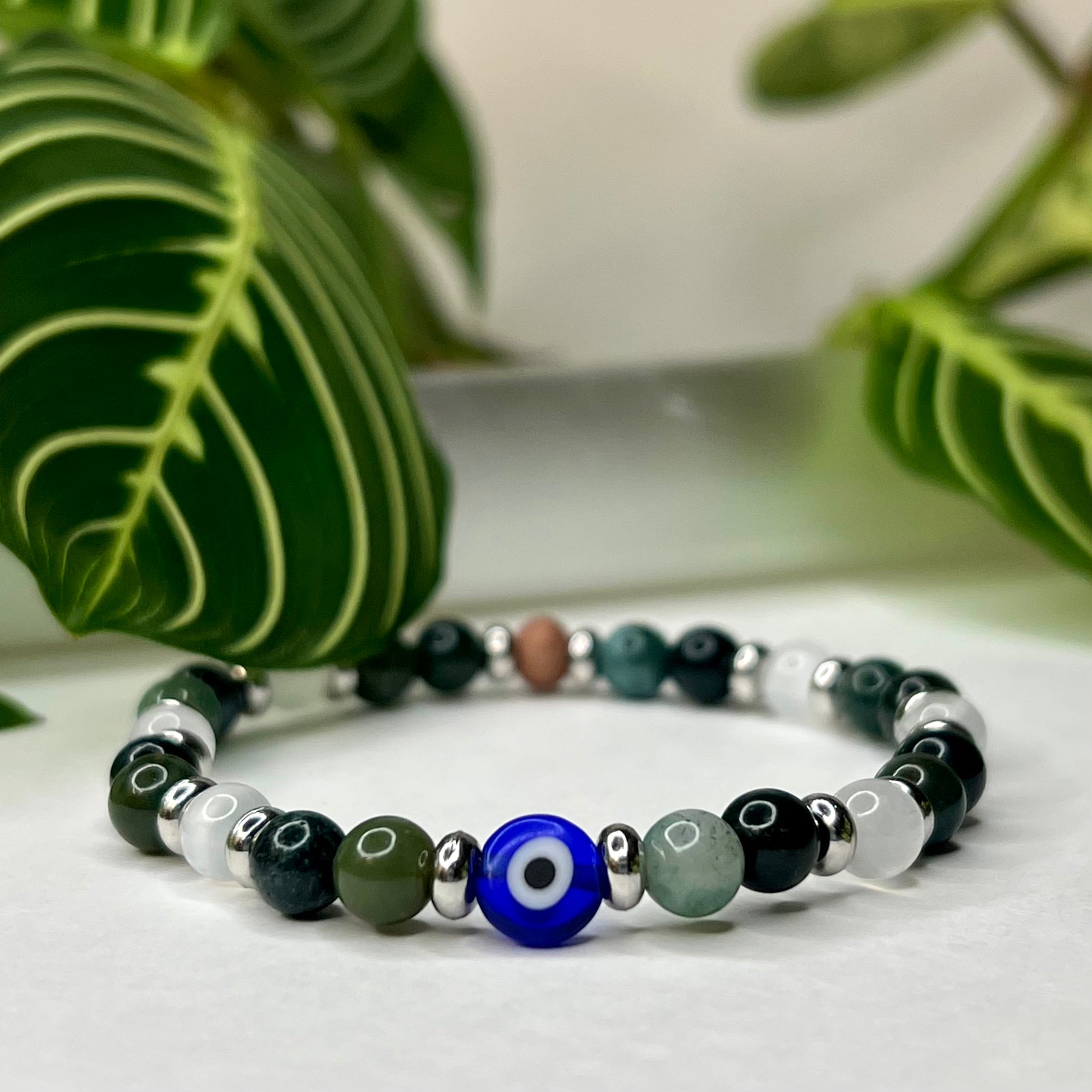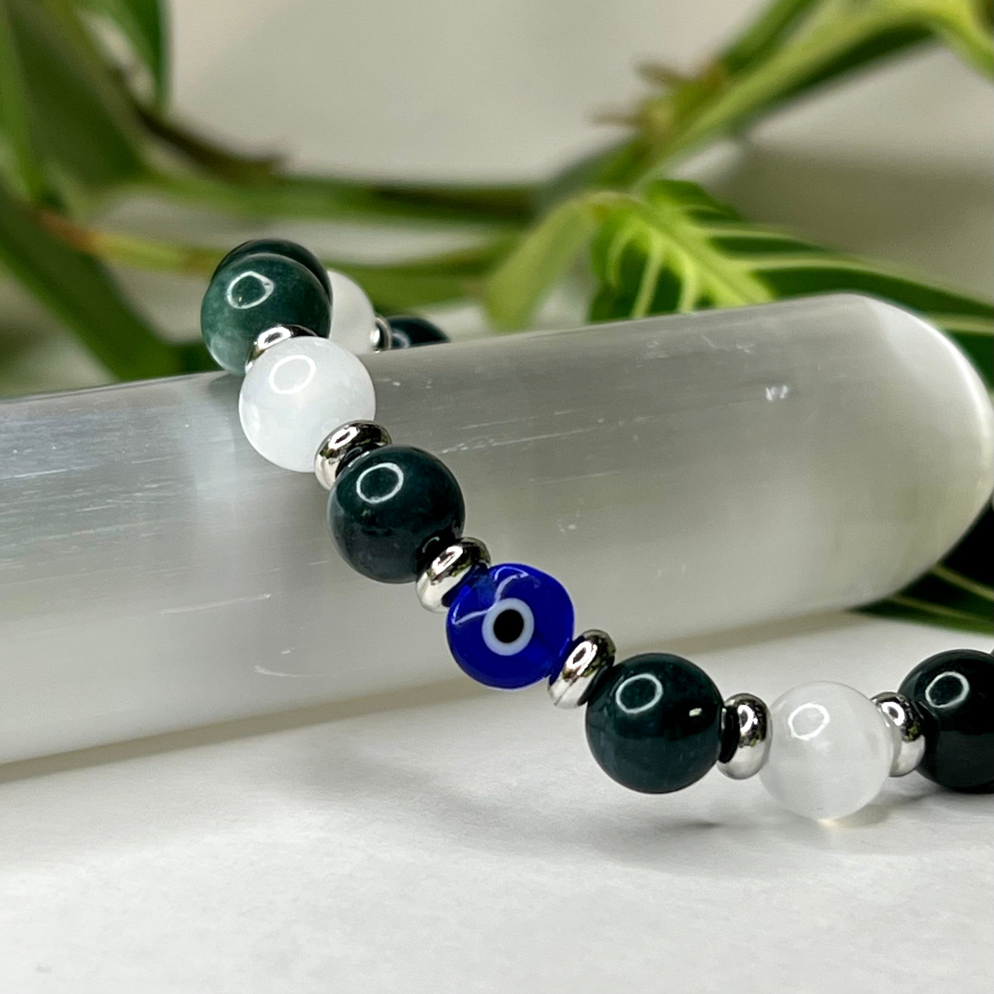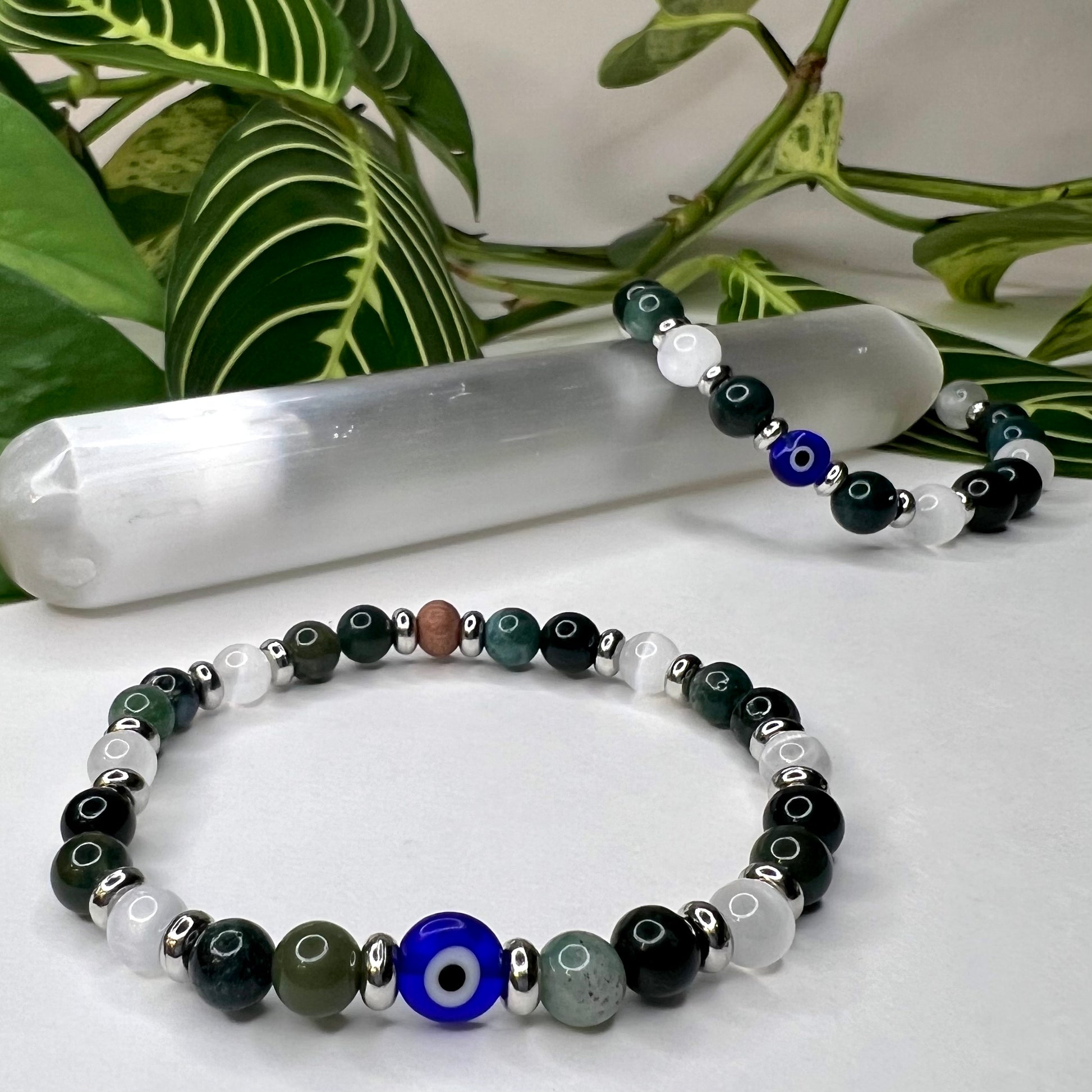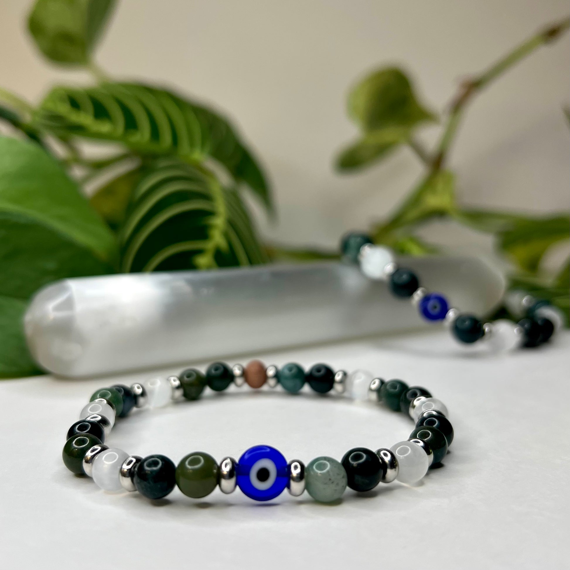 This calming and energetically powerful bracelet blends the grounding energy of Moss Agate, the high-frequency clarity of Selenite, and the ancient protection of the Blue Evil Eye. Reiki-infused to amplify its purpose, this bracelet is designed to stabilize emotions, protect your aura, and promote peace from within.