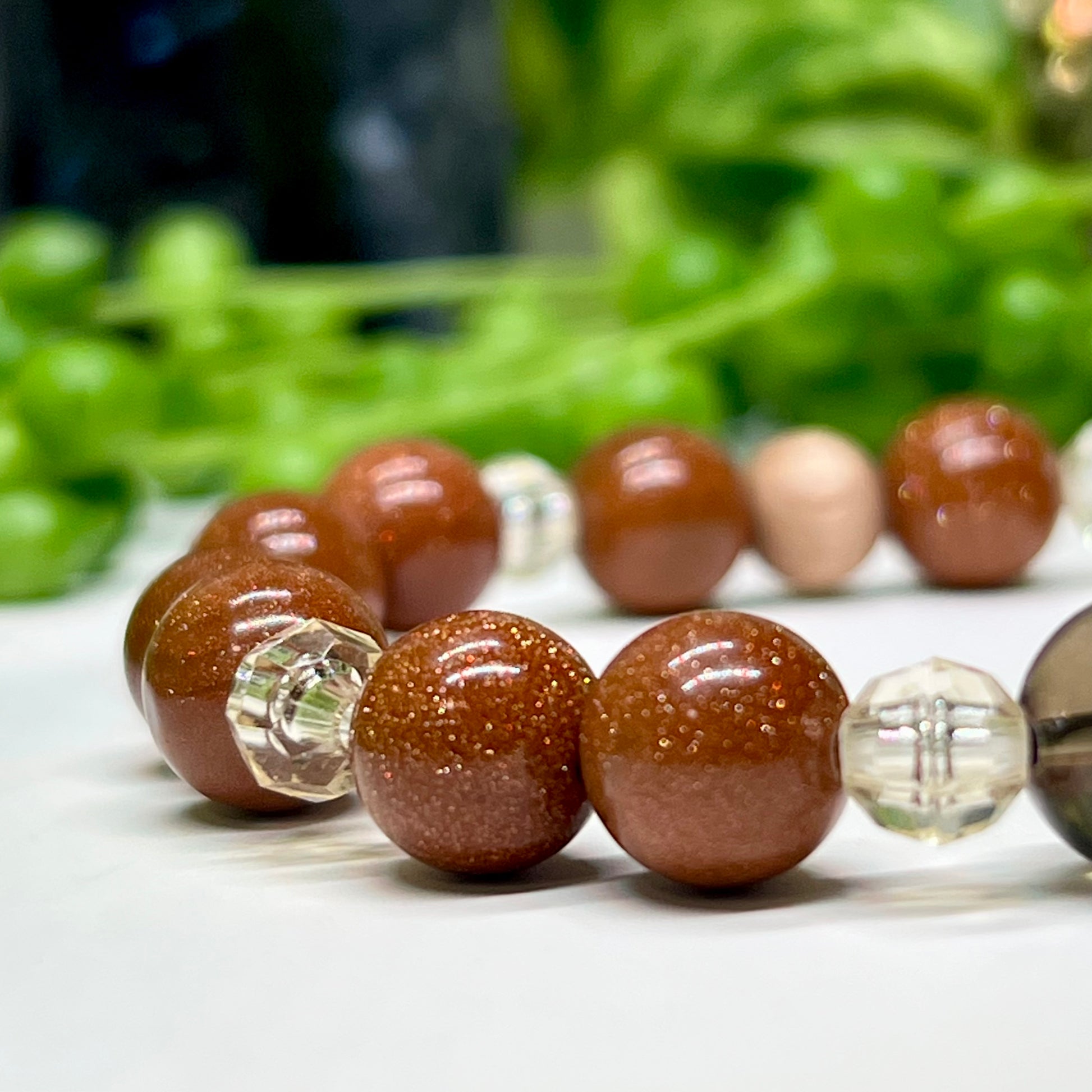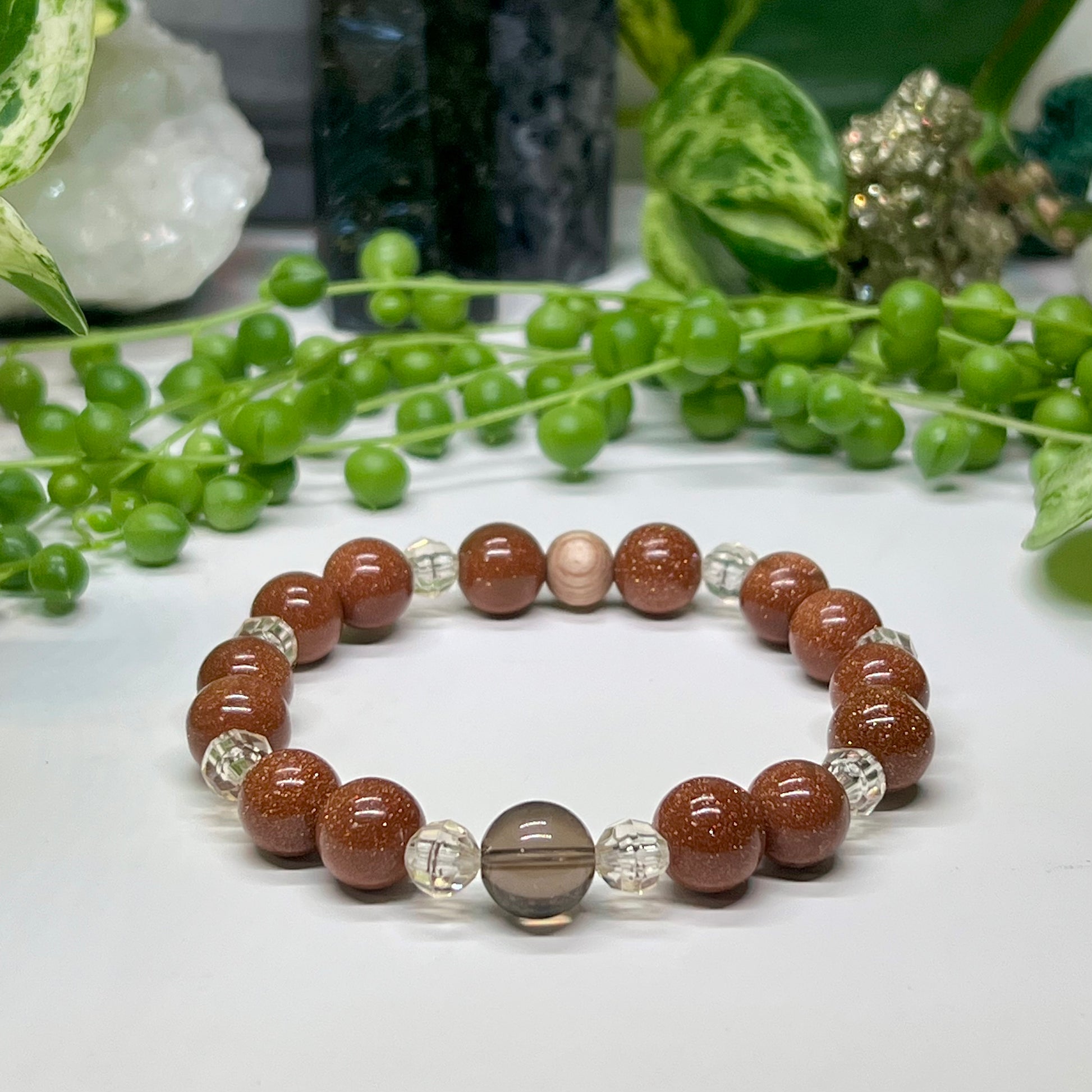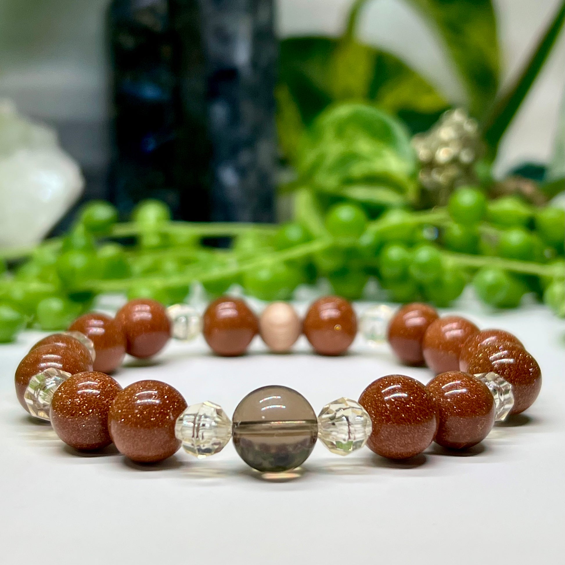 🍯 Champagne Spacers – These warm, metallic-toned spacers represent balance and refinement, enhancing the energy flow between the Smokey Quartz and Goldstone. Their golden hue resonates with abundance, joy, and solar energy, bringing light to the bracelet’s grounding foundation.