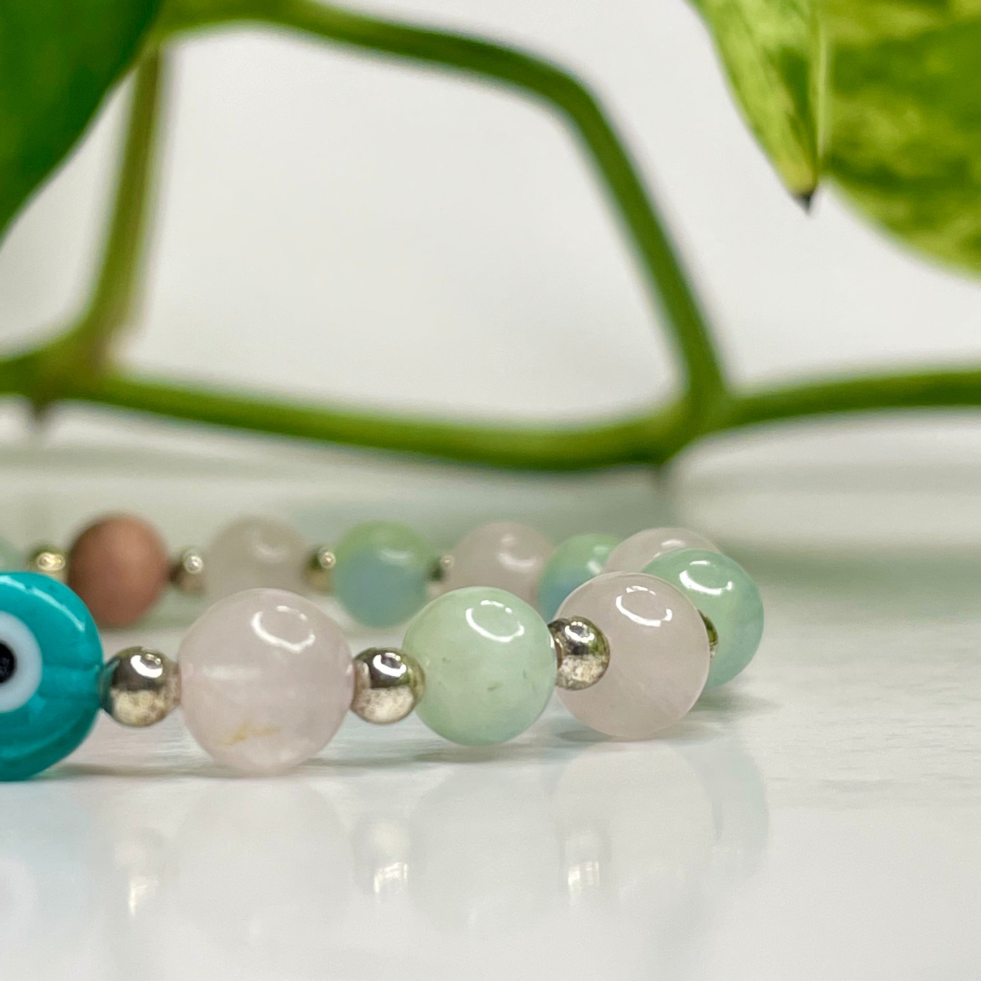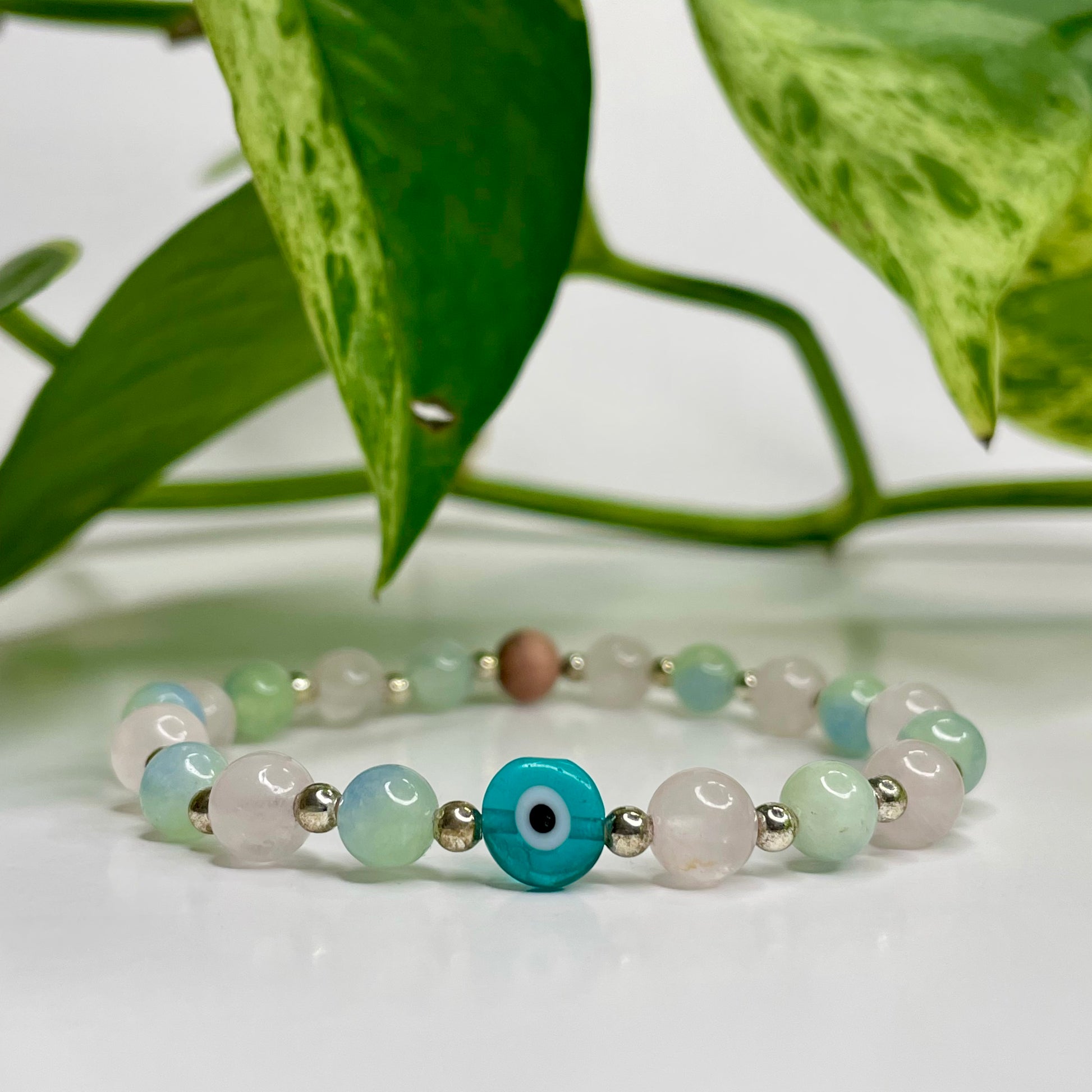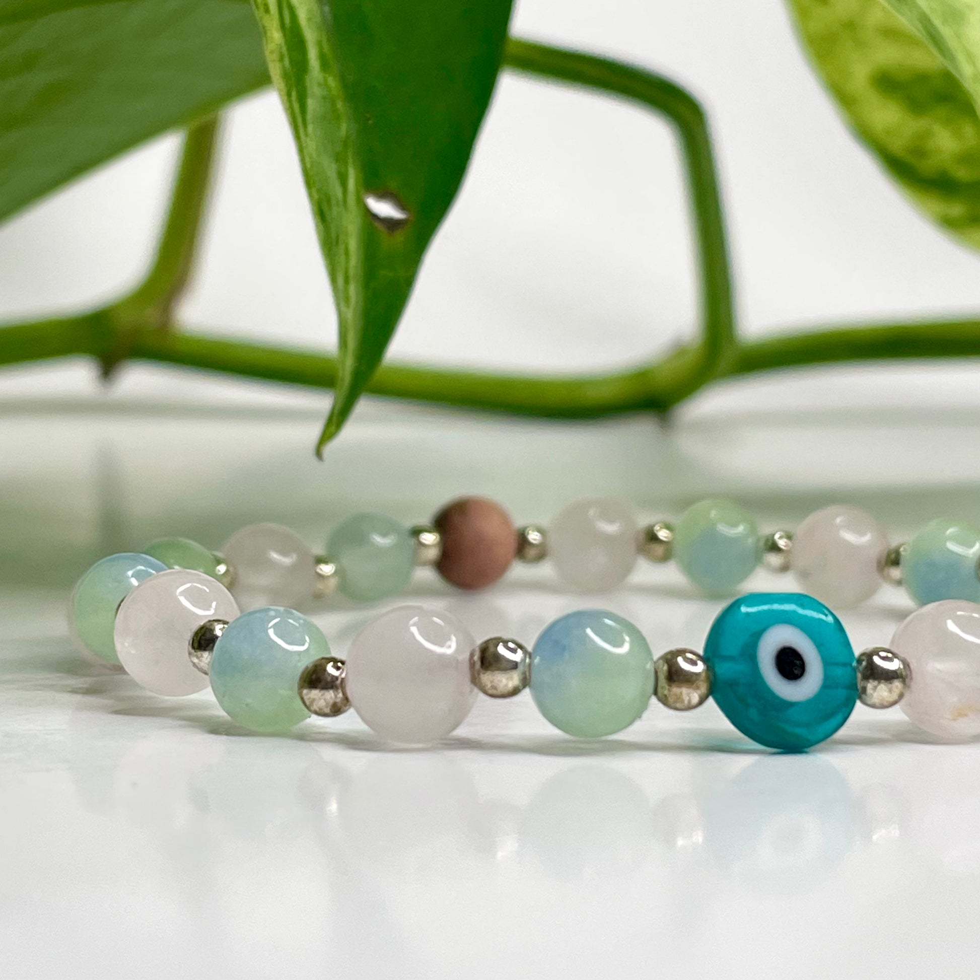 Calm your spirit and protect your energy with this serene blend of Caribbean Chalcedony, Rose Quartz, and the Teal Evil Eye. Reiki-infused to deepen emotional healing and promote inner harmony, this bracelet brings you into a space of peace, clarity, and self-love.
