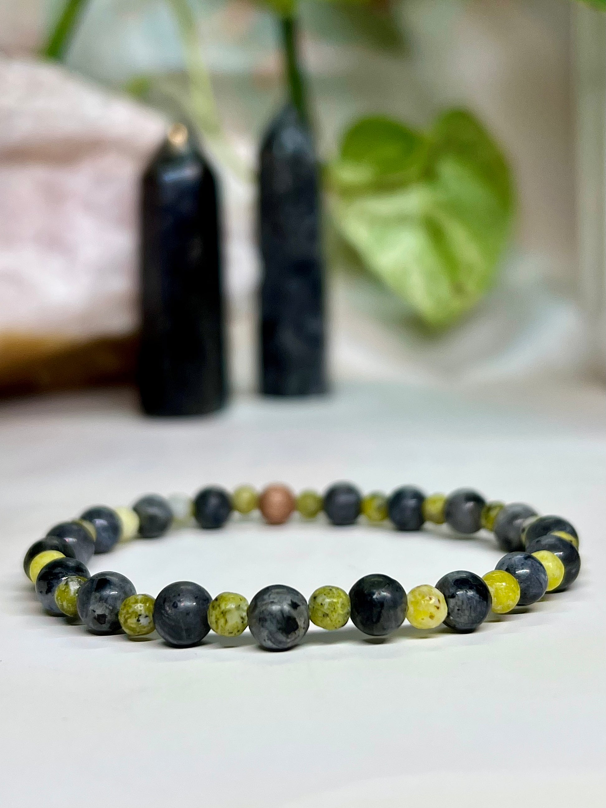 This striking bracelet blends the mysterious energy of Black Labradorite with the sunny optimism of Yellow Jasper, grounded by warm Rosewood. Black Labradorite is known for its powerful protective and transformative qualities, shielding your aura from negativity while enhancing intuition and spiritual insight. Yellow Jasper brings uplifting, joyful energy that boosts confidence and mental clarity, helping you stay positive and motivated throughout your day. The natural Rosewood bead adds a soothing, grounding element, creating a balanced synergy of strength, protection, and optimism. Wear this bracelet to embrace your inner light while navigating life’s challenges with grace and courage.