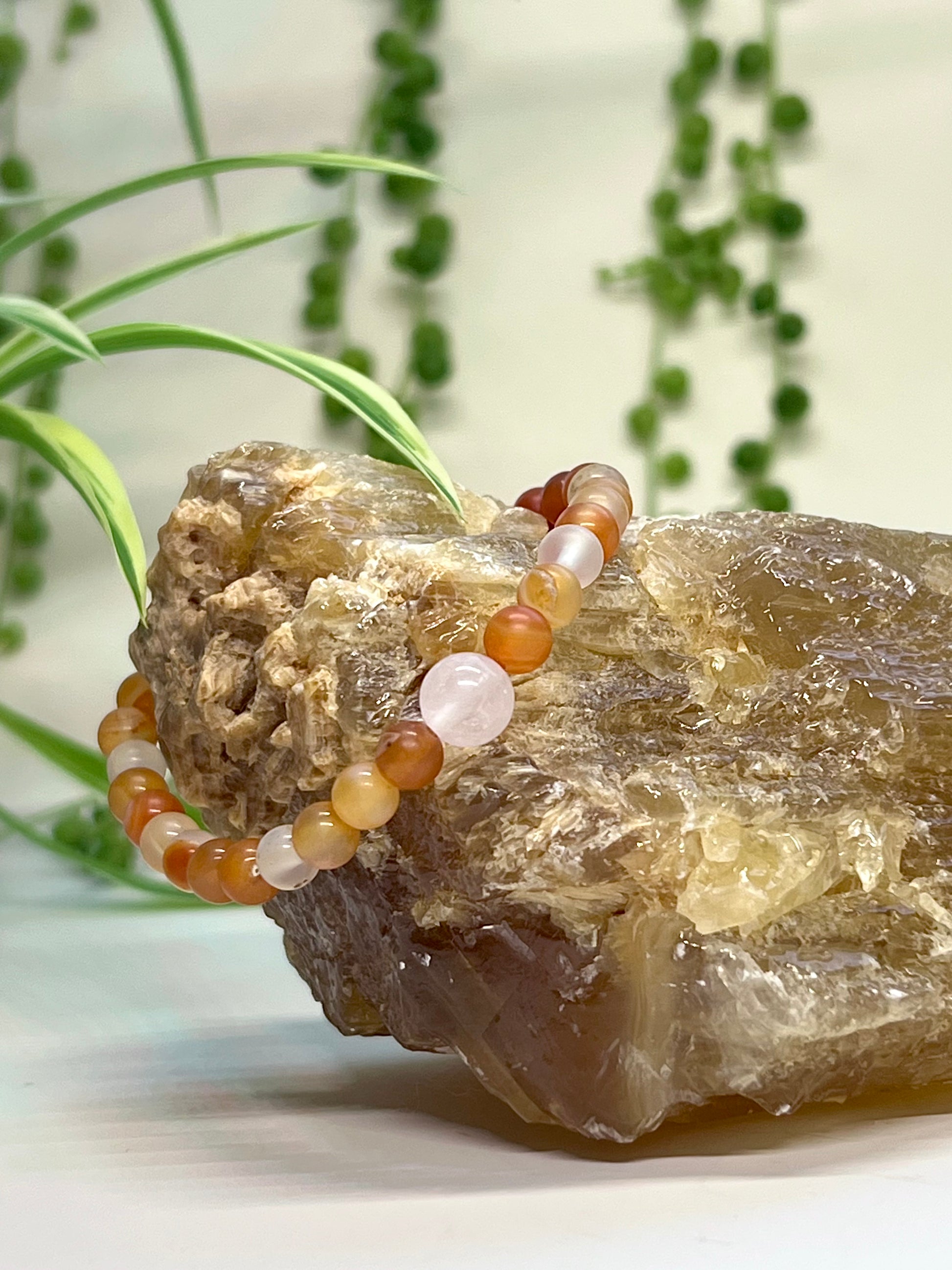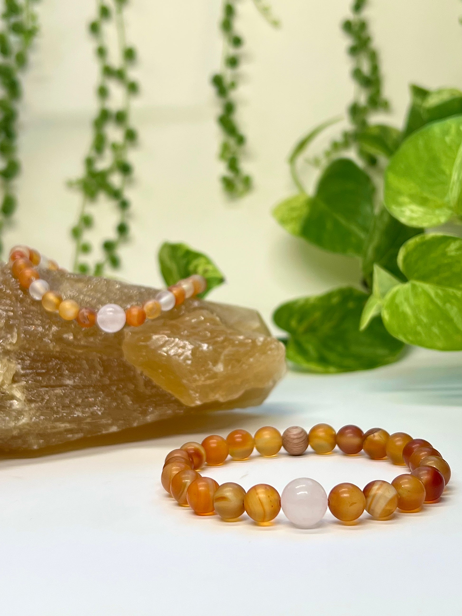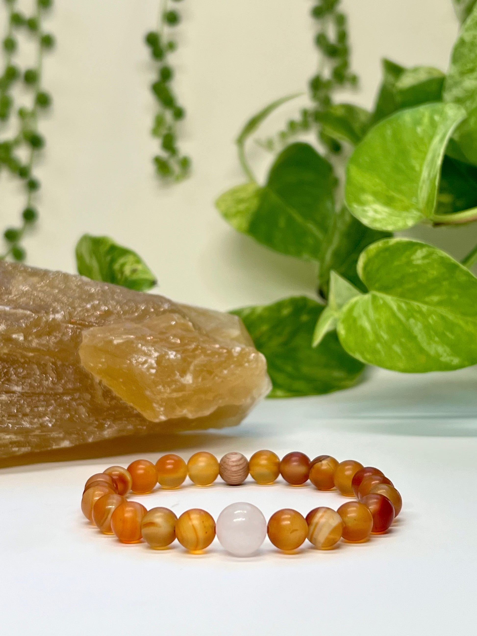 This radiant bracelet combines the energizing warmth of Frosted Carnelian with the gentle, loving vibes of Rose Quartz to inspire confidence, passion, and emotional healing. Frosted Carnelian’s vibrant energy sparks motivation and courage, helping you overcome challenges with joy and enthusiasm. The single 8mm Rose Quartz bead offers a soft heart-centered touch, promoting self-love, compassion, and inner peace. Grounded by the natural Rosewood bead, this bracelet harmonizes energy, love, and calm, perfect for those seeking balance between drive and tenderness.