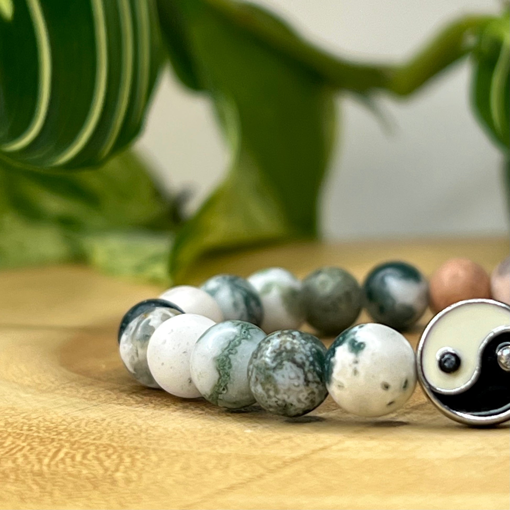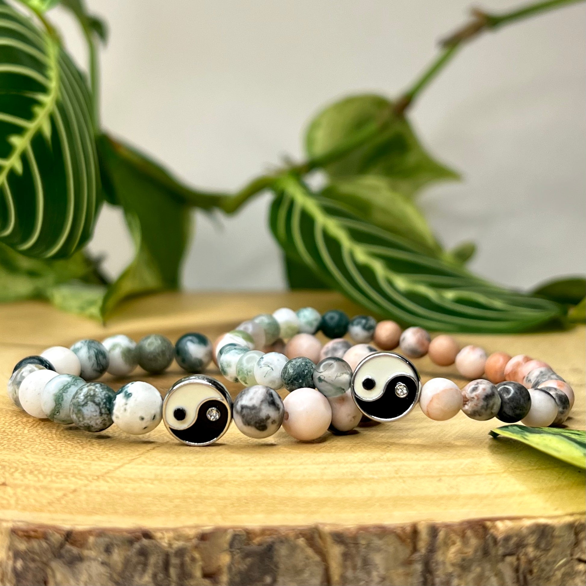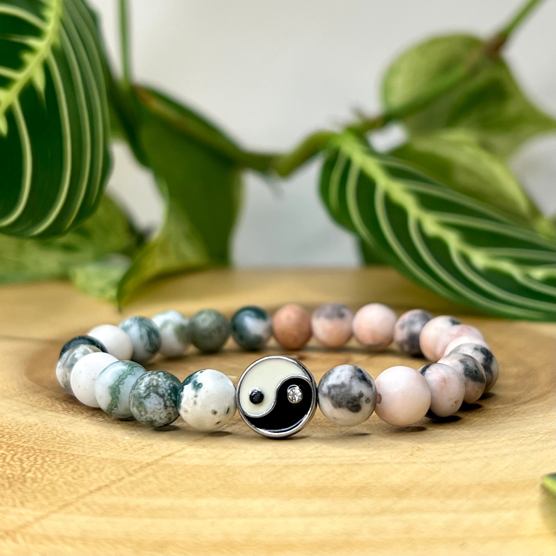 This bracelet channels the essence of duality and harmony, featuring the Yin and Yang symbol as a reminder of balance within opposites, light and shadow, strength and softness, action and stillness. Reiki-infused and energetically aligned, this bracelet combines the gentle power of Tree Agate and Pink Zebra Jasper to promote deep calm, emotional equilibrium, and focused intention.