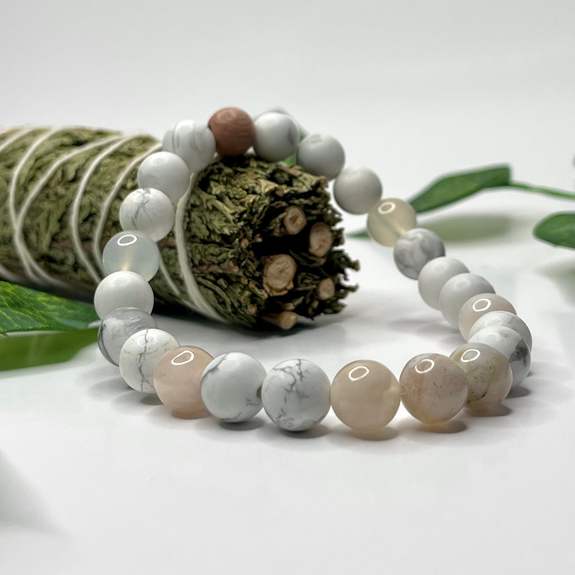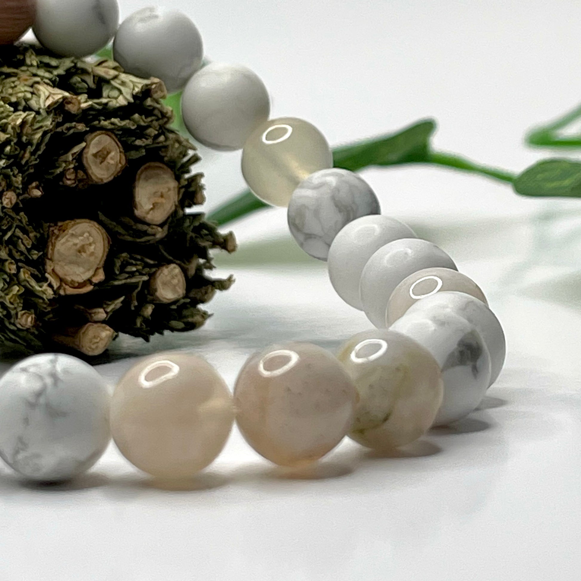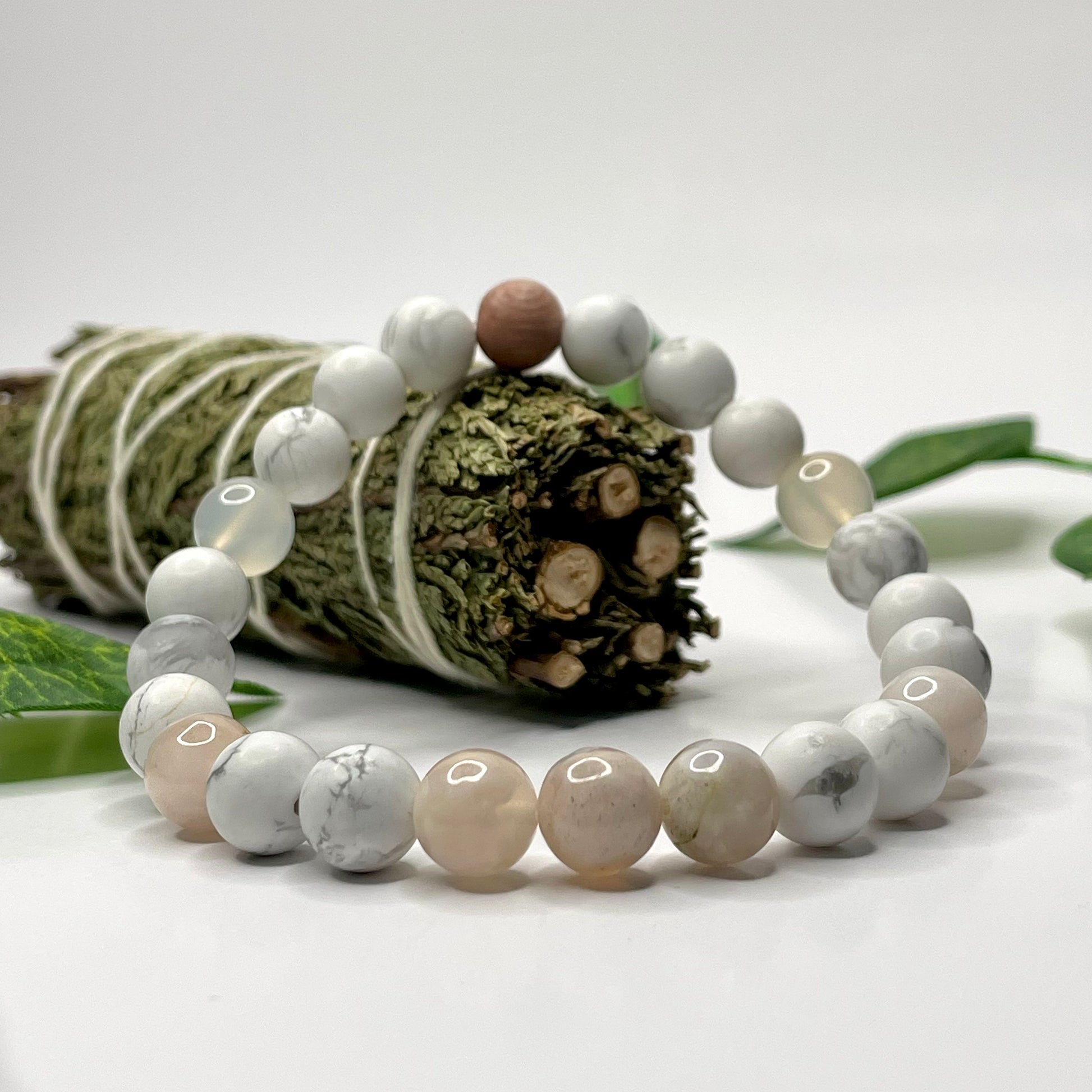 Howlite and Flower Agate come together to bring you soothing calm and gentle emotional support.